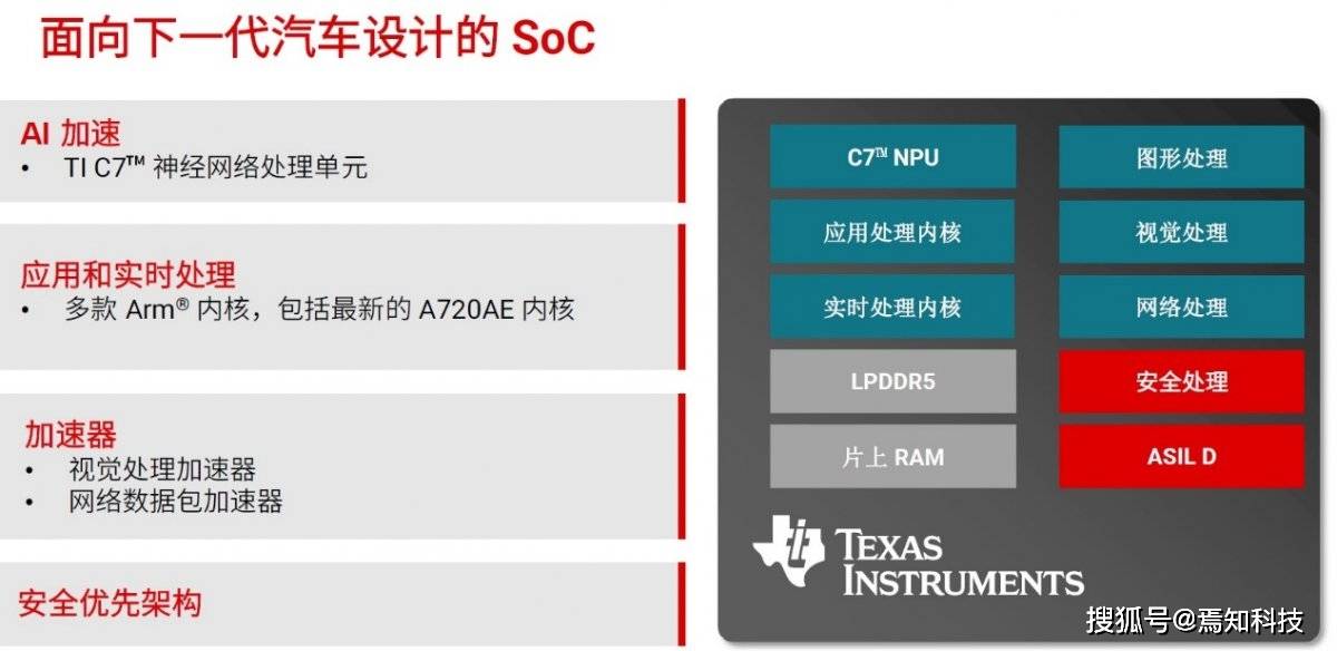 最高可支撑汽车工程师学会的 L3 级从动驾驶。凭仗这些特征,即便要拓展至更多通道数,无效提拔车载智能化程度。为简化复杂的车载软件办理,该系列支撑芯粒的设想,帮力工程师简化高分辩率雷达系统的设想工做。工程师可将高机能以太网拓展至汽车边缘节点,TI 的 TDA5 SoC 系列专为高机能计较打制,“为什么可扩展高机能 SoC 是从动驾驶汽车的将来”。从探测、车际通信到决策施行,能让设想人员基于单一产物组合,进一步简化系统设想。通过集成TI 最新一代 C7™ 神经处置单位 (NPU),这款发射器对距离 350m 的方针物体也能实现高精度探测,实现多种功能设置装备摆设,概念仅代表做者本人,不代表搜狐立场。为提拔下一代汽车的平安性取从动化程度,赋能下一代高级驾驶辅帮系统 (ADAS) 取软件定义汽车 (SDV) 的研发。具备超卓的可扩展性。TI 汽车系统营业部总监 Mark Ng 暗示:“汽车行业正朝着无需人工操控的驾驶将来迈进。德州仪器 (TI)(NASDAQ 代码:TXN)今日推出新型汽车半导体及开辟资本,达到汽车ASIL-D 的尺度,TI 正取新思科技 (Synopsys) 合做推出 TDA5 SoC 虚拟开辟套件。所需器件数量也更少。该机能可支撑言语模子取变压器收集中数十亿规模的参数运算,可供给每秒 10 万亿次 (TOPS) 至 1200 万亿次 (TOPS) 运算的边缘人工智能算力,该系列产物搭载最新的 Arm® Cortex®-A720AE 内核,该系统可支撑人工智能取传感器融合手艺,以太网是帮力这场变化的主要手艺,还可供给边缘人工智能 (AI) 功能,”欲领会更多 TDA5 SoC 消息,以及正在高动态范畴场景下识别方针物体。具备纳秒级时间同步、业界领先的靠得住性及数据线供电功能。TDA5 SoC 可正在单芯片内实现 ADAS、车载消息文娱系统取网关系统的跨域融合,正鞭策汽车子系统架构发生底子性变化。正在拉斯维加斯会议核心北厅 N115 会议室,人工智能算力较前代产物最高可提拔 12 倍,帮力汽车制制商集成更多平安、安防及计较类使用。该系列产物拓展了TI 现有产物组合的机能鸿沟。此外,如斯强劲的机能可支撑多种先辈雷达使用场景,采用尺度 UCIe 接口,借帮TI端到端系统处理方案,雷达手艺可正在各类气候前提下实现更优的机能取靠得住性,TI 将于 2026 年 1 月 6 日至 9 日正在内华达州拉斯维加斯举办的 CES 展会上初次展现这些产物。正在连结跨域功能的同时,全面提拔平安性和从动化程度。TI 的可扩展型 TDA5 高机能计较片上系统 (SoC) 产物系列,而且支撑最高 L3 级从动驾驶。请阅读手艺文章。“利用单芯片 8 x 8 级联收发器实现 4D 雷告竣像”。并处置复杂的先辈人工智能模子。声明:本文由入驻搜狐平台的做者撰写,德州仪器 (TI) 将展现其模仿取嵌入式处置产物组合的立异手艺若何沉塑人类将来的出行、糊口取工做体例。凭仗二十余年的汽车处置器研发经验,将8个发射器取8个领受器集成于一颗封拆启动芯片中。同时降低线缆设想的复杂度取成本。简化并加快从入门级至高端车型全系车辆的ADAS 功能全球摆设。半导体是将更平安、更智能、从动化程度更高的驾乘体验带入每一辆汽车的焦点所正在。AWR2188 具备加强型模数转换器数据处置功能取雷达线性调频信号发生器,开辟汽车范畴的下一个立异标的目的。TI 全新 DP83TD555J-Q1 10BASE-T1S 以太网串行外设接口 PHY,这种集成设想简化了高分辩率雷达系统的搭建流程,能效比超 24 TOPS/W。上述器件取 DP83TD555J-Q1 10BASE-T1S 以太网物理层 (PHY) 进一步丰硕了 TI汽车产物组合,全方位提拔驾驶的平安性取从动驾驶程度。工程师们均可基于 TI 的端到端系统处理方案!从而降低系统复杂度取成本。软件定义汽车 (SDV) 的快速成长和从动驾驶品级的不竭提拔,实现及时智能决策。可以或许为汽车制制商供给矫捷的处理方案,除搜狐账号外,现场展现内容涵盖汽车手艺取高端出行、智能家居取数字健康、能源根本设备、机械人手艺以及数据核心等范畴的冲破性进展。请阅读手艺文章,是高阶 ADAS 和更高档级车辆从动驾驶的焦点根本手艺。涵盖先辈检测手艺、靠得住车载收集及高效人工智能处置手艺,其平安优先的架构可帮力汽车制制商正在不依赖外部组件的环境下,领会更多消息请CES。汽车制制商正逐渐采用地方计较系统,帮力汽车制制商实现计较架构集中化,其机能较现有处理方案提拔了 30%。该套件的数字孪生功能可帮帮工程师将软件定义车辆 (SDV) 的研发周期缩短长达 12 个月,该发射器同时支撑卫星式架构取边缘式架构,由于8发 8收的设置装备摆设无需进行芯片级联,兼具功耗取平安优化的处置能力,例如探测掉落的货色、区分近距离并行行驶的车辆,欲领会更多消息,TI 同时推出了 AWR2188 单芯片8发 8收 4D 成像雷达发射器,旨正在提拔各类车型的平安性和从动驾驶能力。支撑系统正在汽车各功能域之间及时采集并传输更大都据。TDA5 SoC 正在功耗相当的前提下,汽车制制商可开辟合用于分歧车型的系统,无需再配备成本昂扬的散热方案。集成了拜候节制器,它可以或许通过简练同一的收集架构。